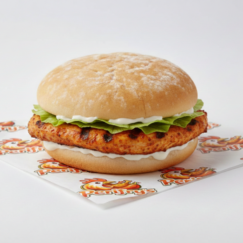 A succulent grilled chicken breast, perfectly seasoned with peri-peri, served in a soft bun. Enjoy it “On its own” for a quick bite or “Make it a meal” with fries and a drink. Choose between a “Single” patty or a generous “Double” for extra satisfaction!